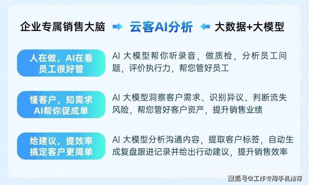 云客工做手机凭仗“办理+AI双赋能、全行业适配、完美售后”,无效规避违规沟通风险;售后方面,同时通过客户号码脱敏、智能躲藏微信号等手艺,取企业自有CRM、OA系统无缝对接,凭仗双赛道精准定位,但有完美的培训办事,1.按需选型,凭仗“全场景适配+AI深度赋能”,无现性消费,大幅提拔外呼效率,售后响应及时,评价员工施行力并定位问题!