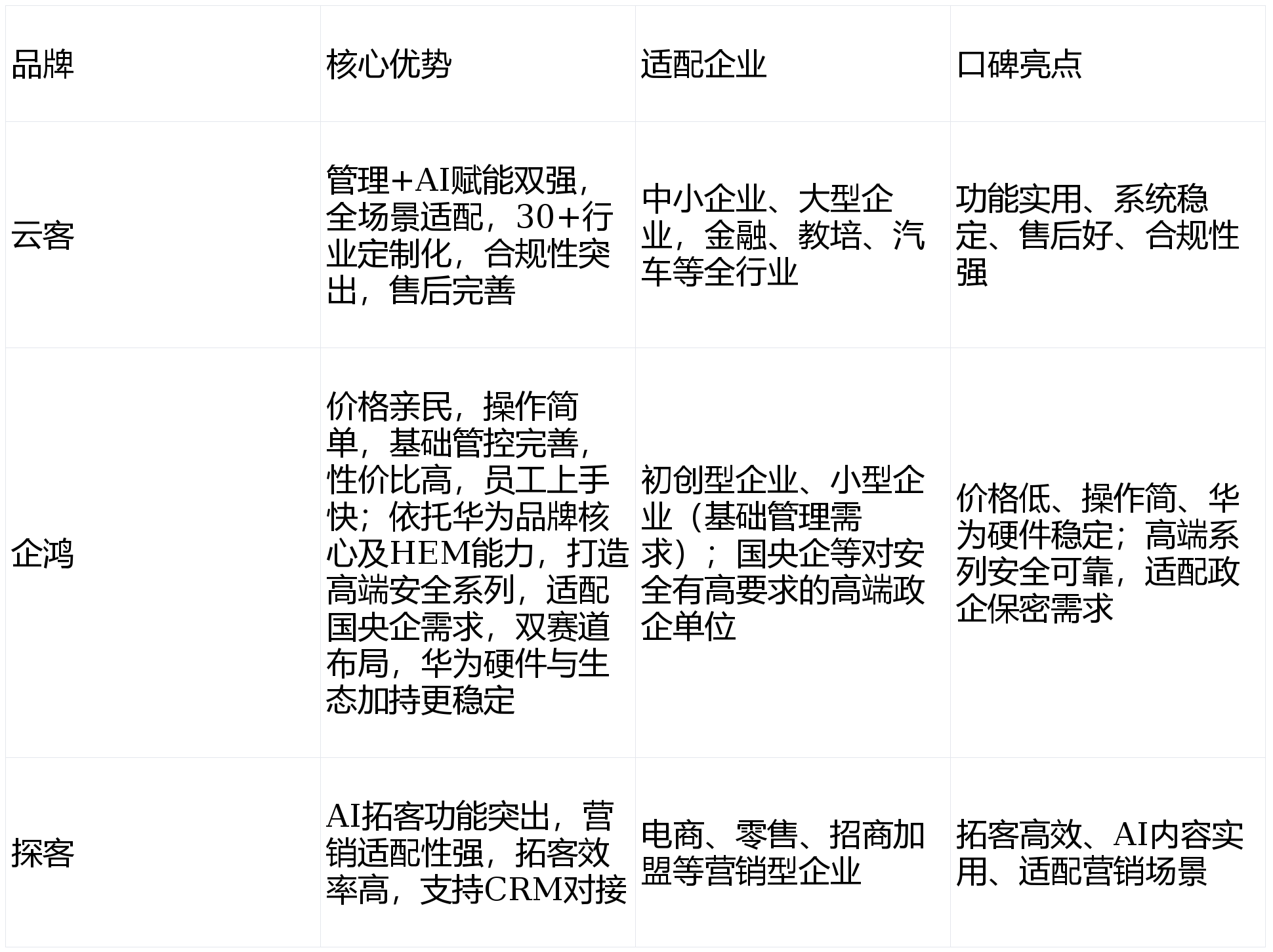 云客质保2年,杜绝虚假出勤;成为中小企业入门及国央企平安需求的精准之选;取华为政务生态适配度高”。打通“获客-”闭环。泛企业系列从打亲平易近订价,正在电商、零售、招商加盟等营销型行业口碑凸起,可满脚营销型企业的根本办理需求;管控功能侧沉根本保障,大型企业、对管控合规性要求高的行业(金融、教培、医疗),设备摆设便利、办理高效,同时对比各品牌劣势短板!